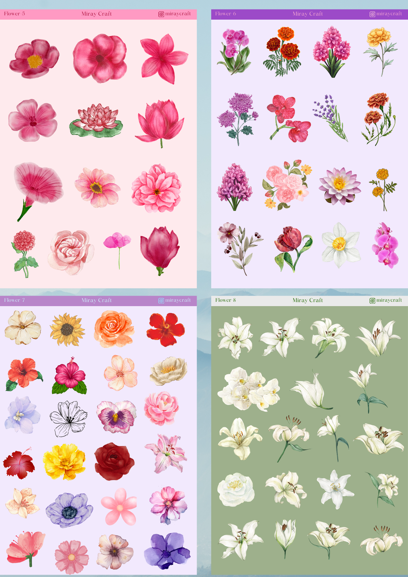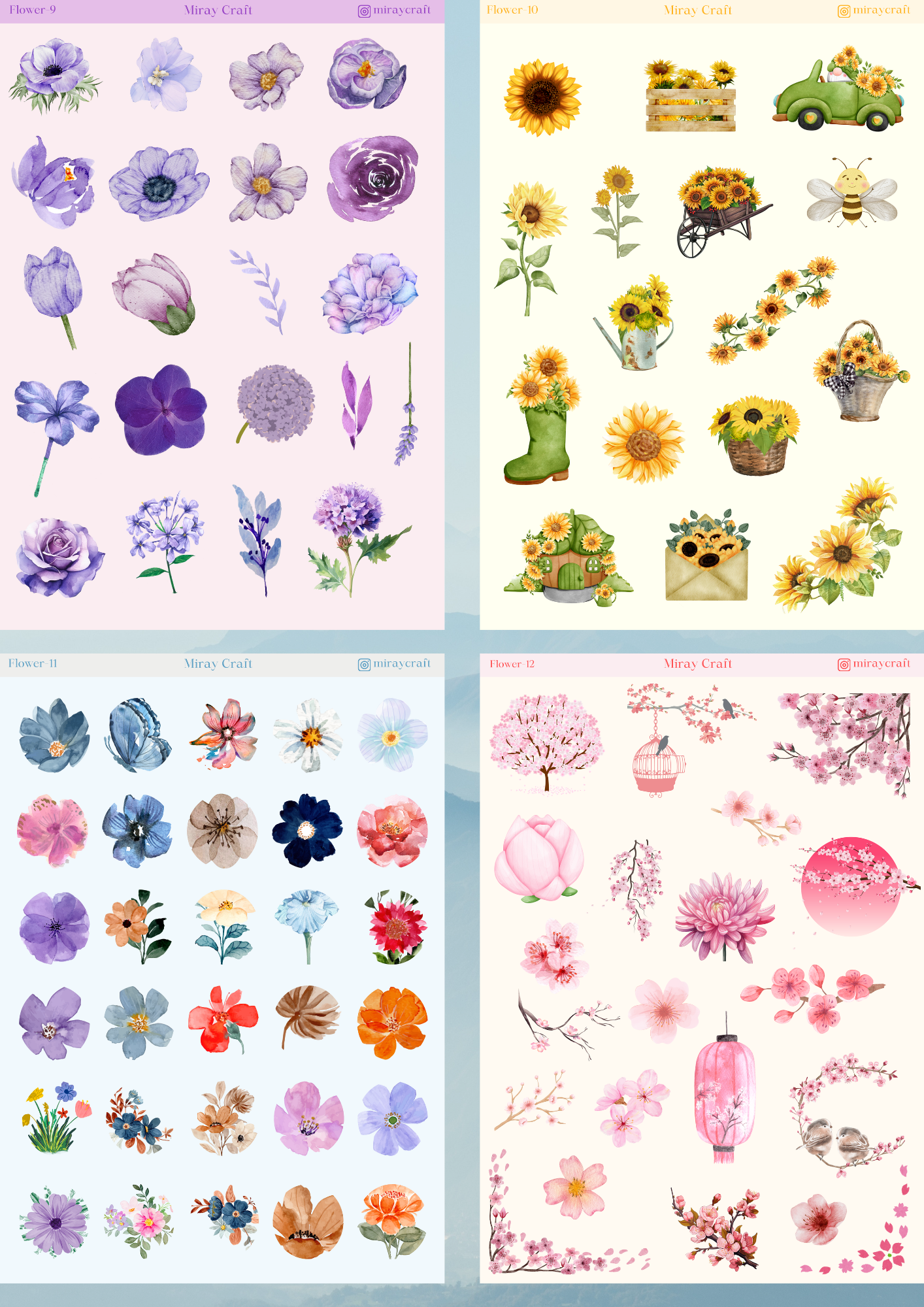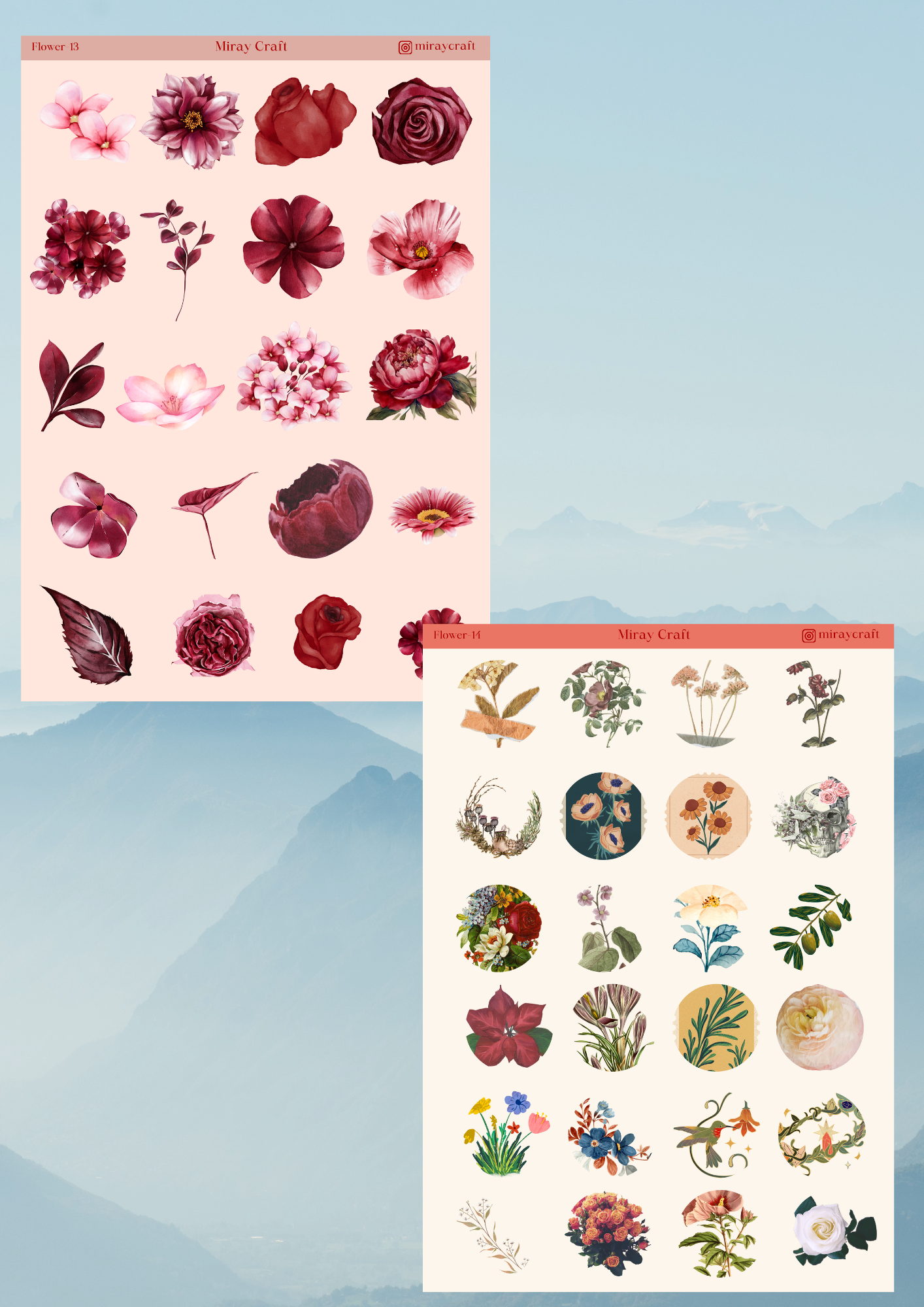 Bu set, tamamen Çiçek temalı 14 özel kesim sticker sayfasından oluşmaktadır. Her bir sayfa 12×17 cm boyutunda, arkası yapışkanlıdır. Bullet journal, ajanda planlayıcı, scrapbook, kolaj ve daha pek çok özgün projede kullanılmak üzere tasarlanmıştır. Kullanım Alanları: