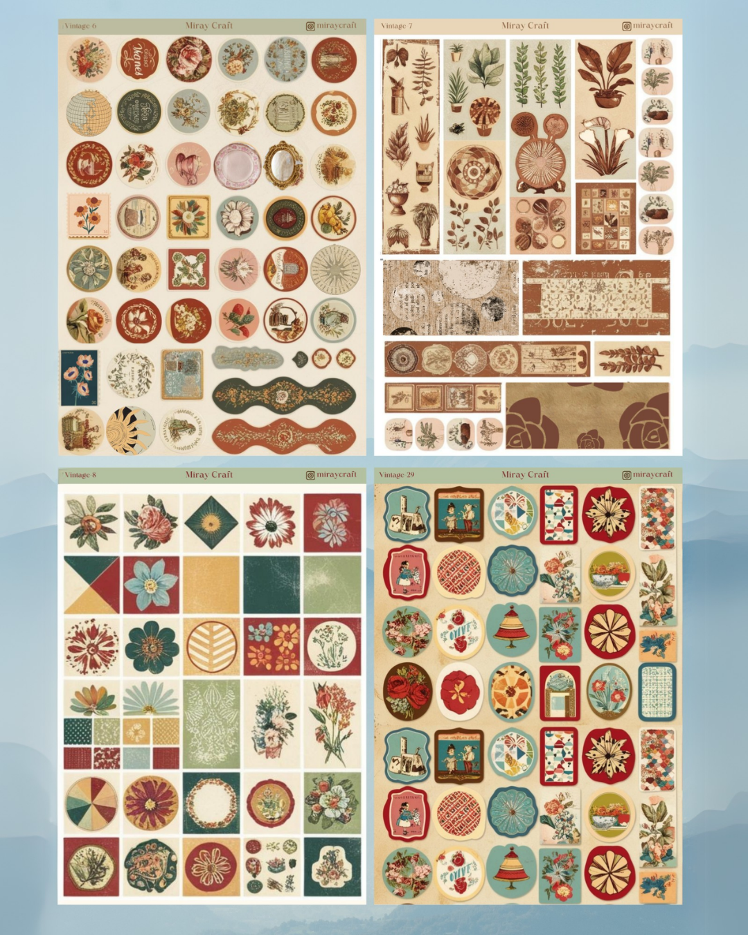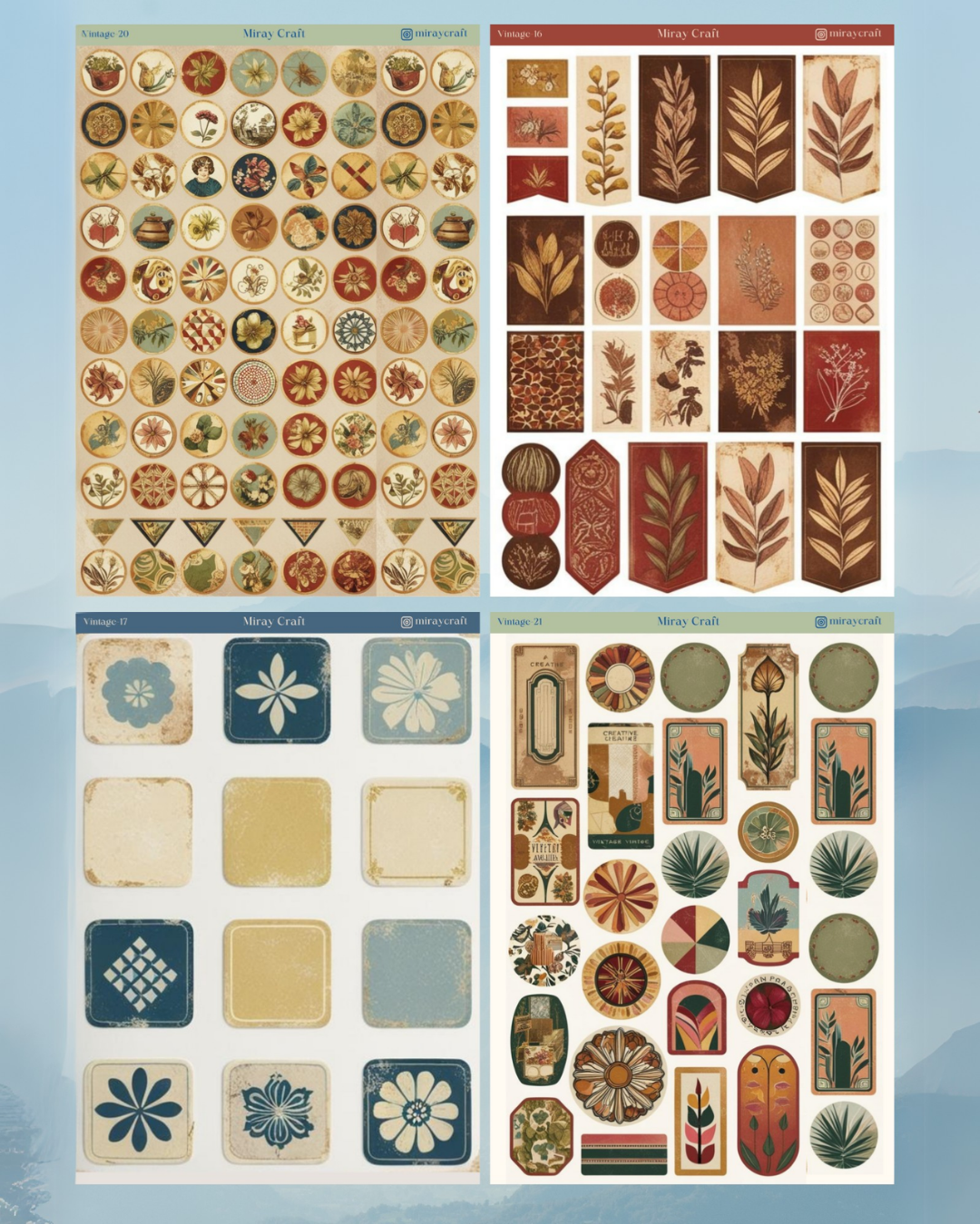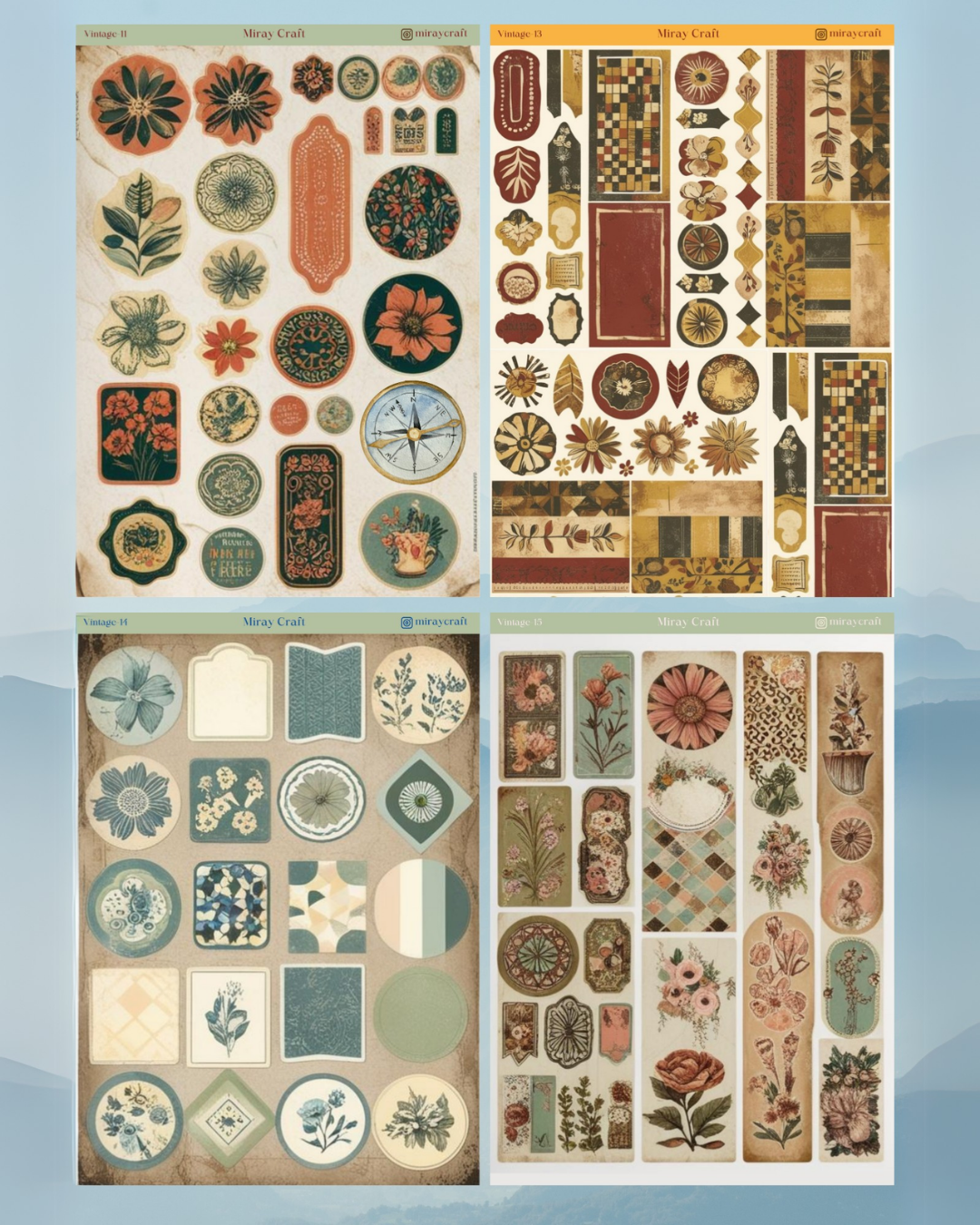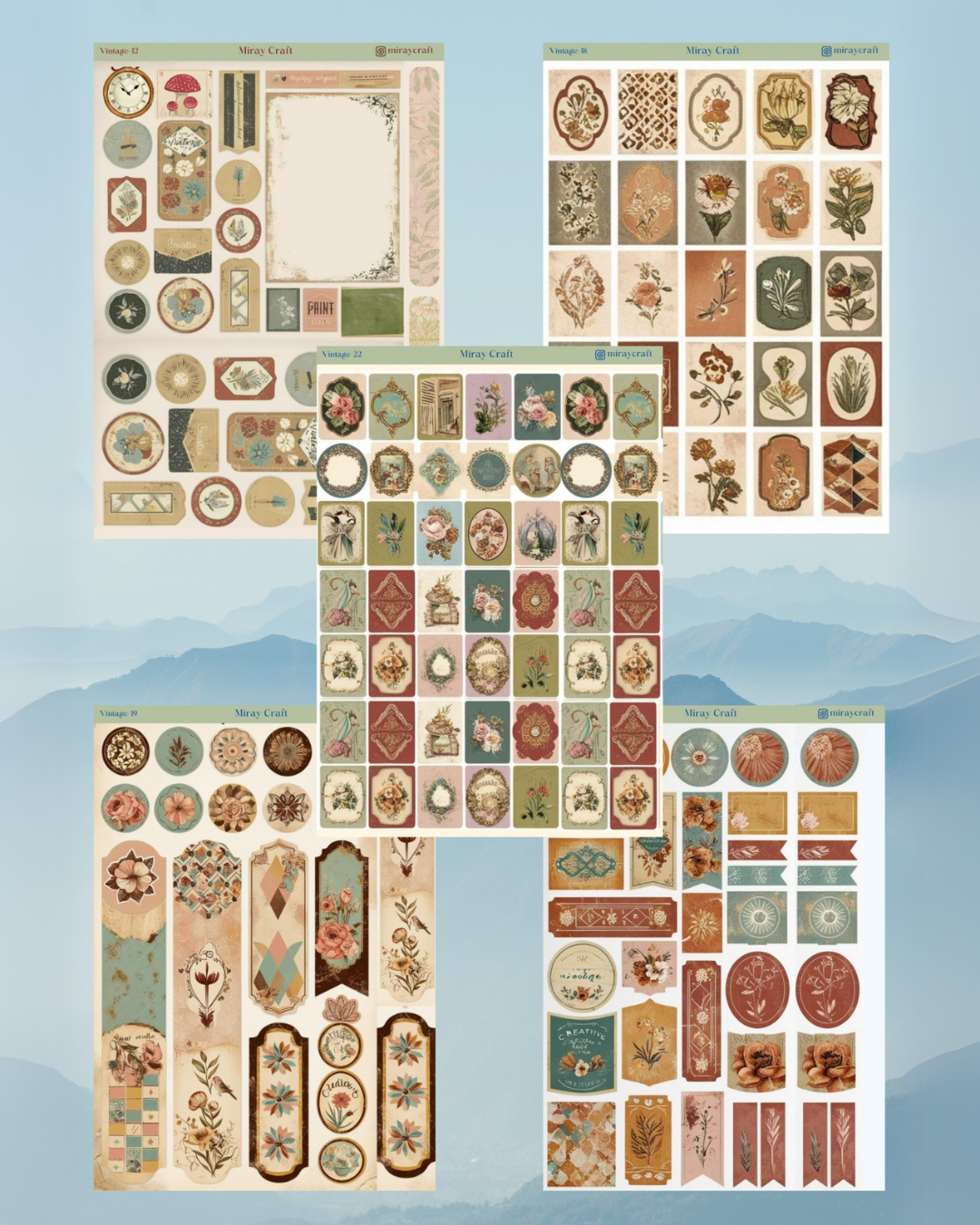 Bu set, tamamen Vintage temalı 17 özel kesim sticker sayfasından oluşmaktadır. Her bir sayfa 12×17 cm boyutunda, arkası yapışkanlıdır. Bullet journal, ajanda planlayıcı, scrapbook, kolaj ve daha pek çok özgün projede kullanılmak üzere tasarlanmıştır. Kullanım Alanları: